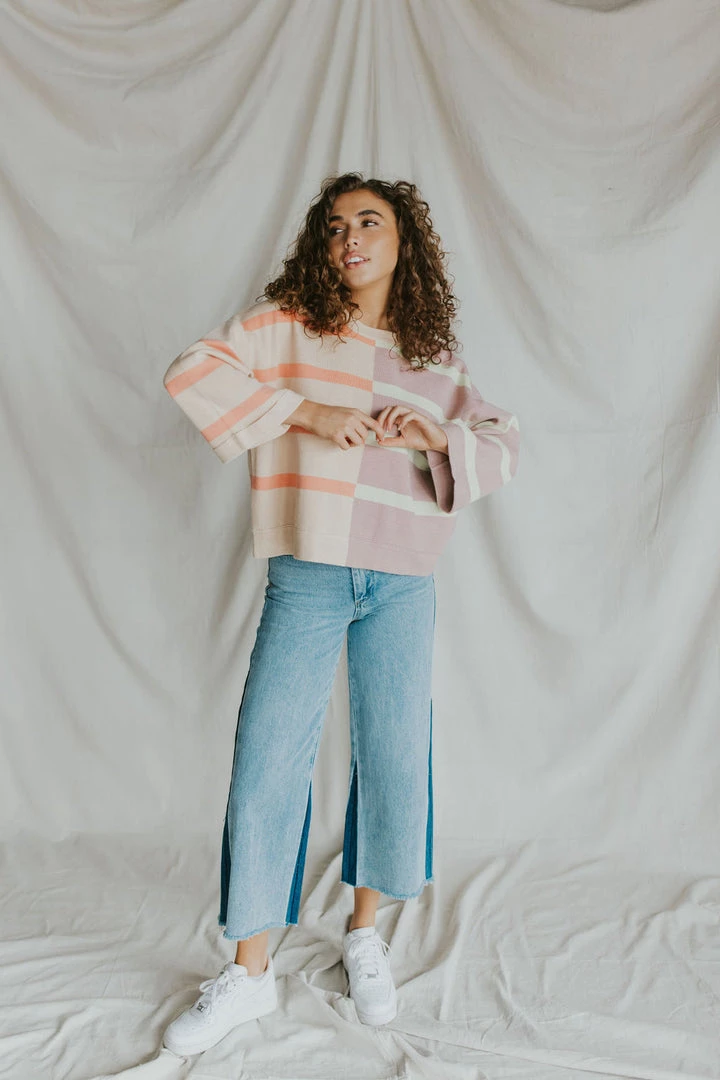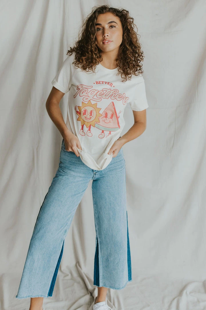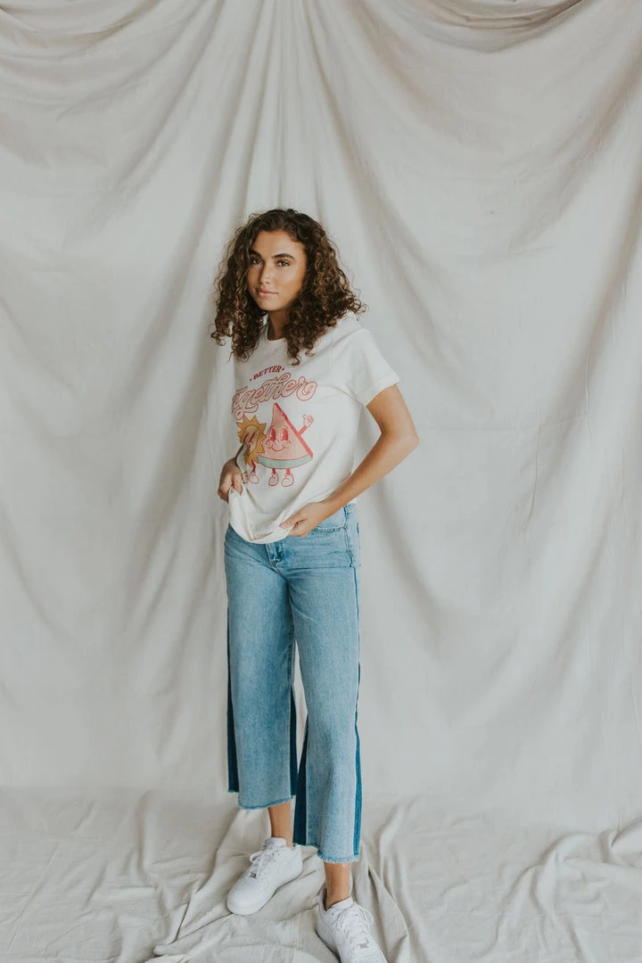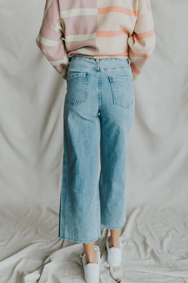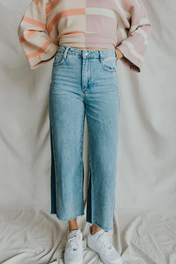 Light wash wide leg denim. Dark denim detail along bottom of pant leg. Minimal stretch.
