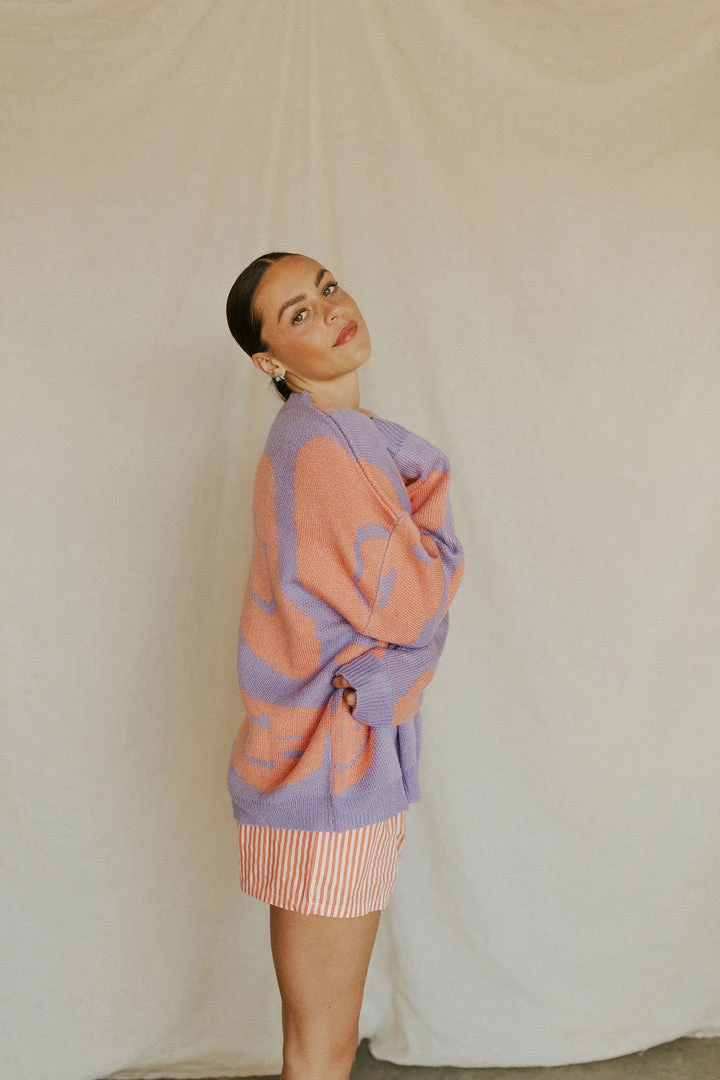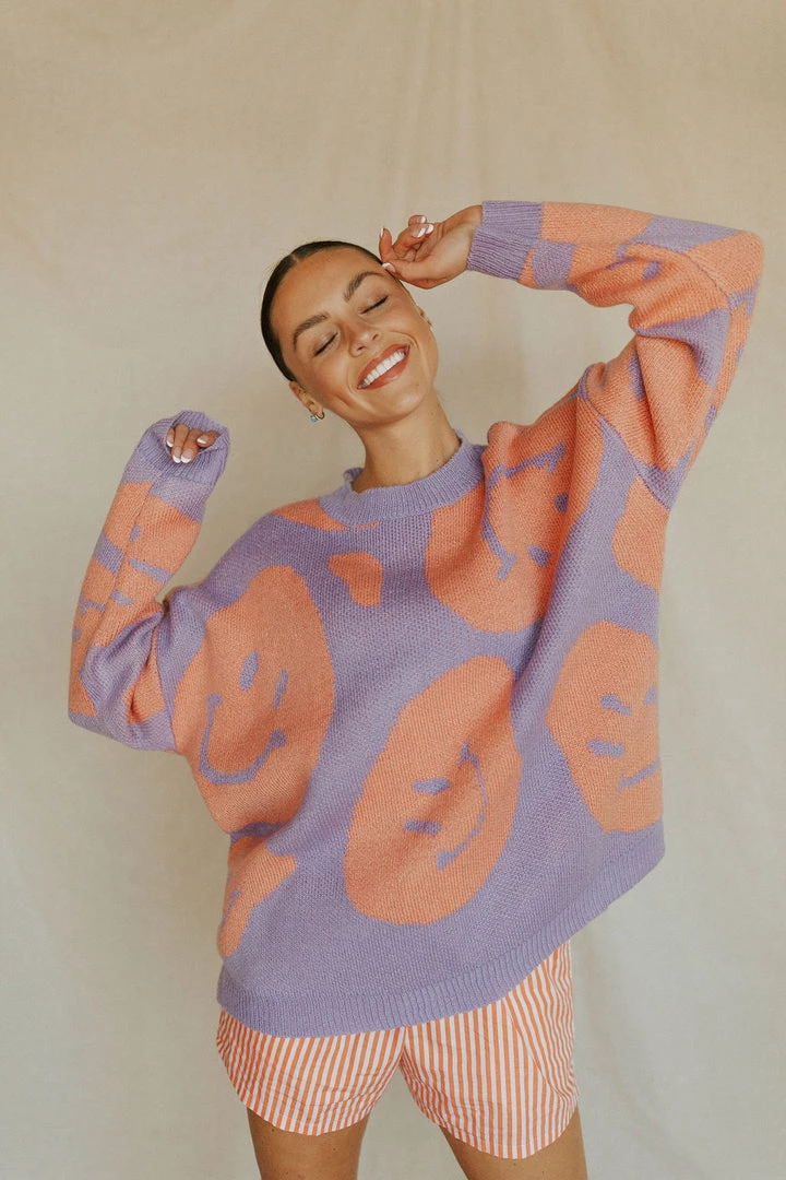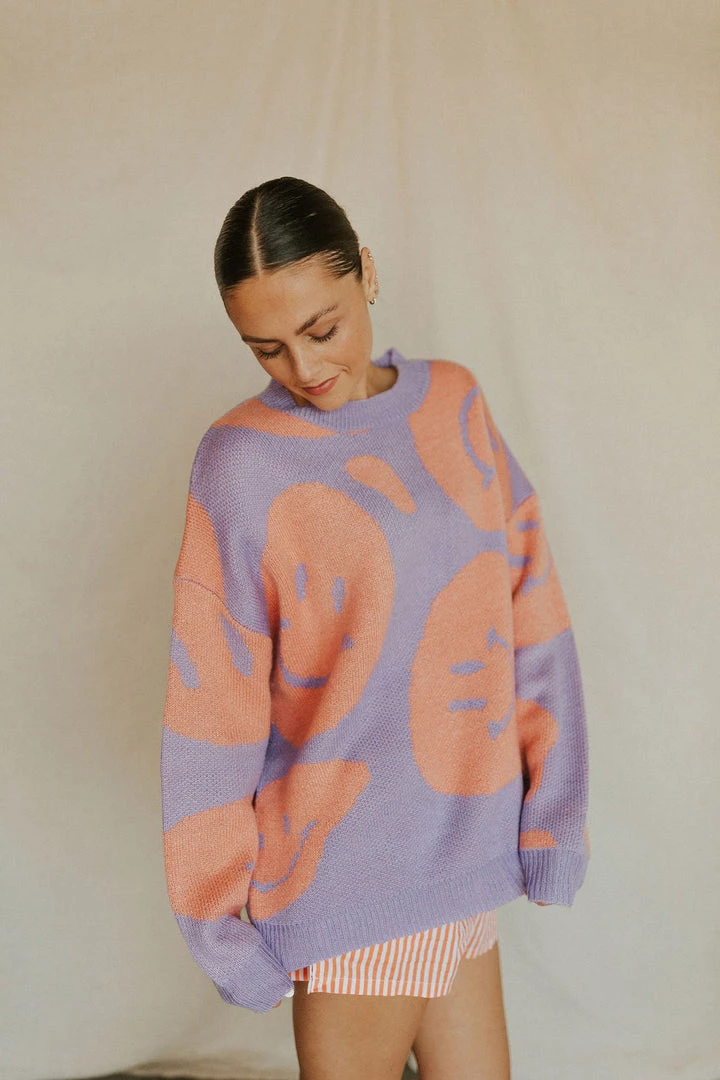 Peach & lavender smiley sweater. Soft washed feel with lots of stretch. Available in multiple colors.