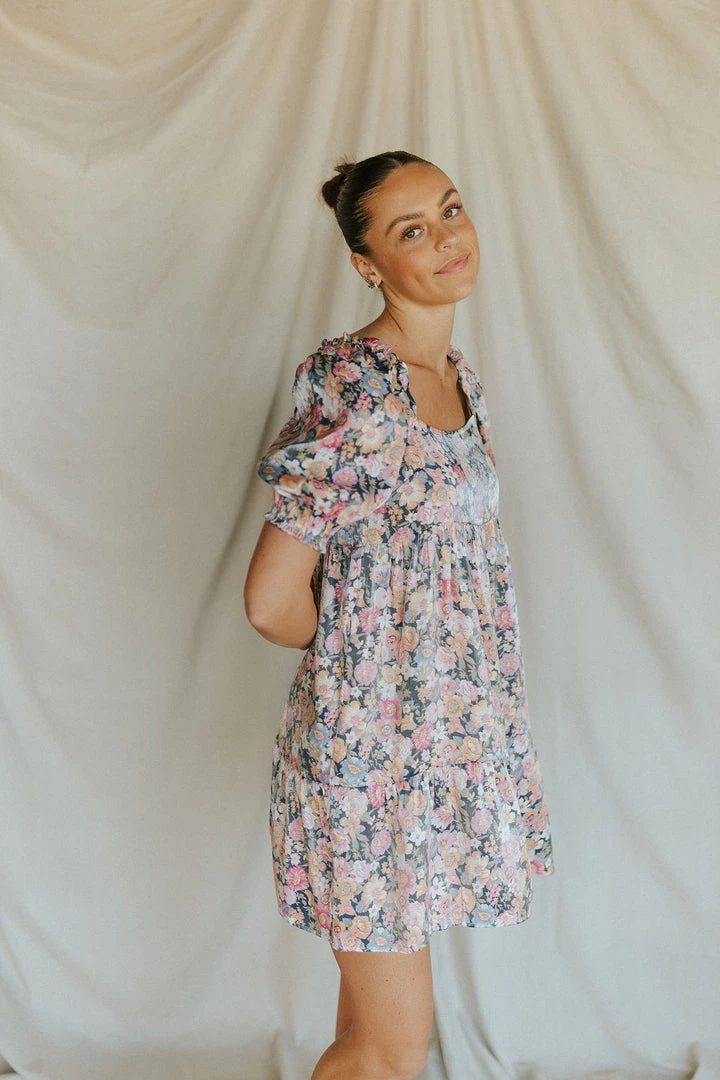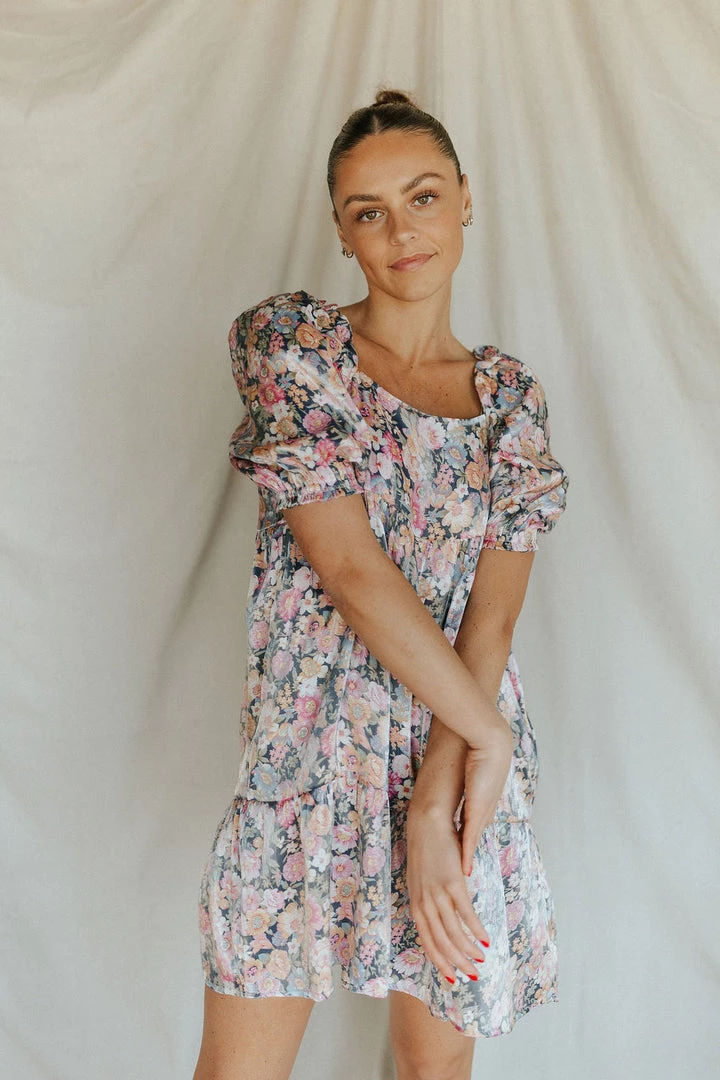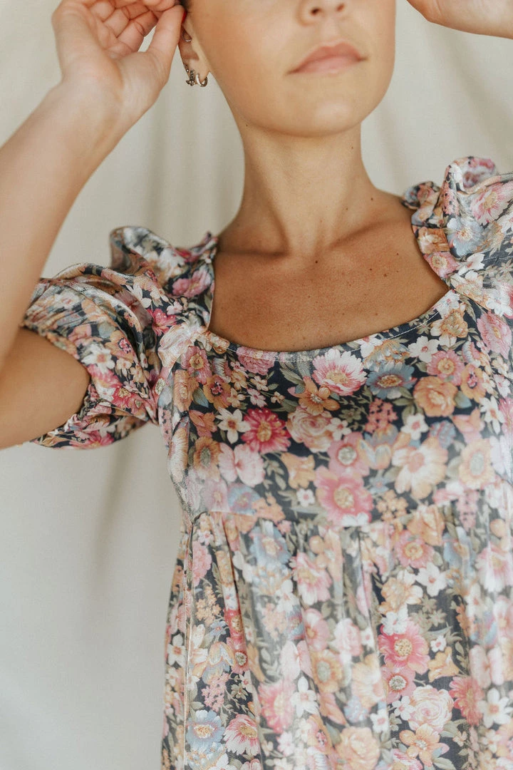Floral mini dress with metallic sheen. Available in multiple colors. Elastic on sleeves. Square neckline.