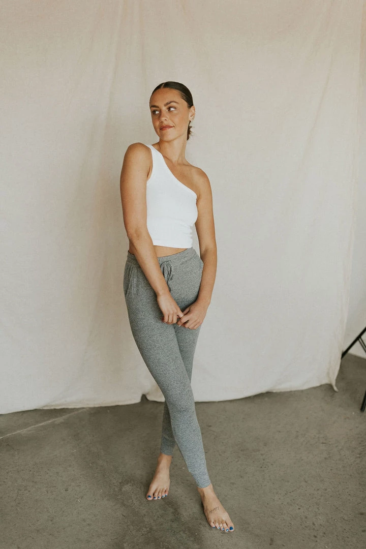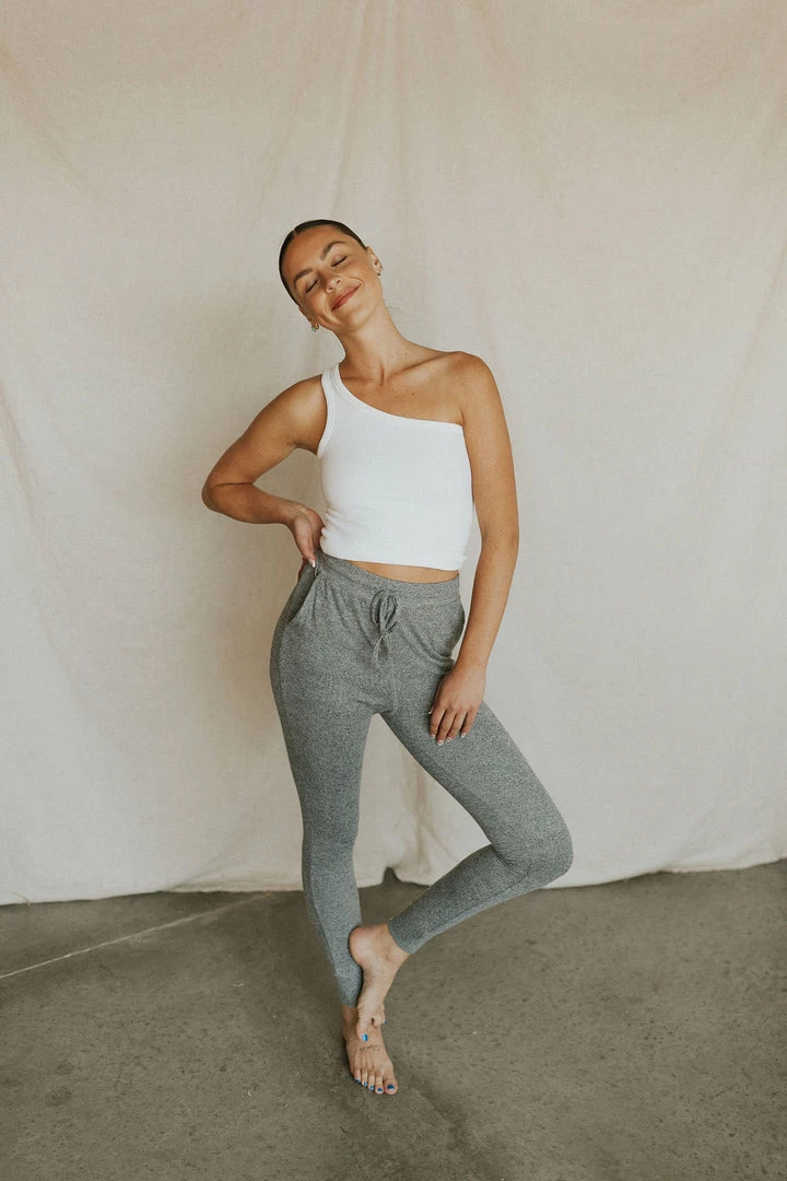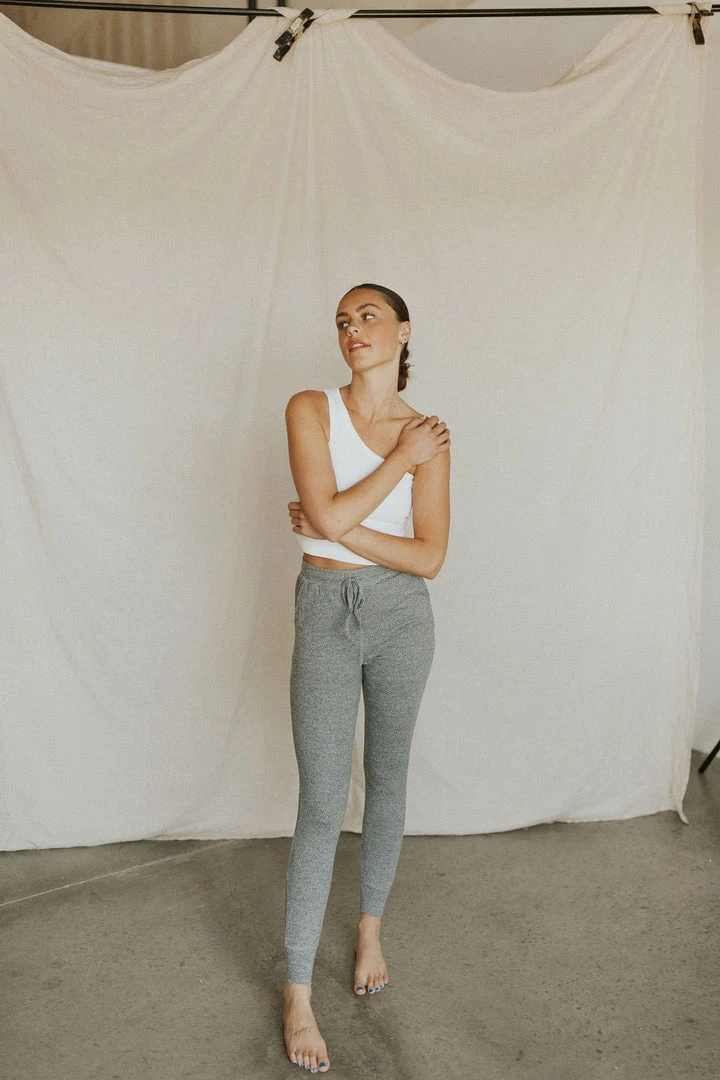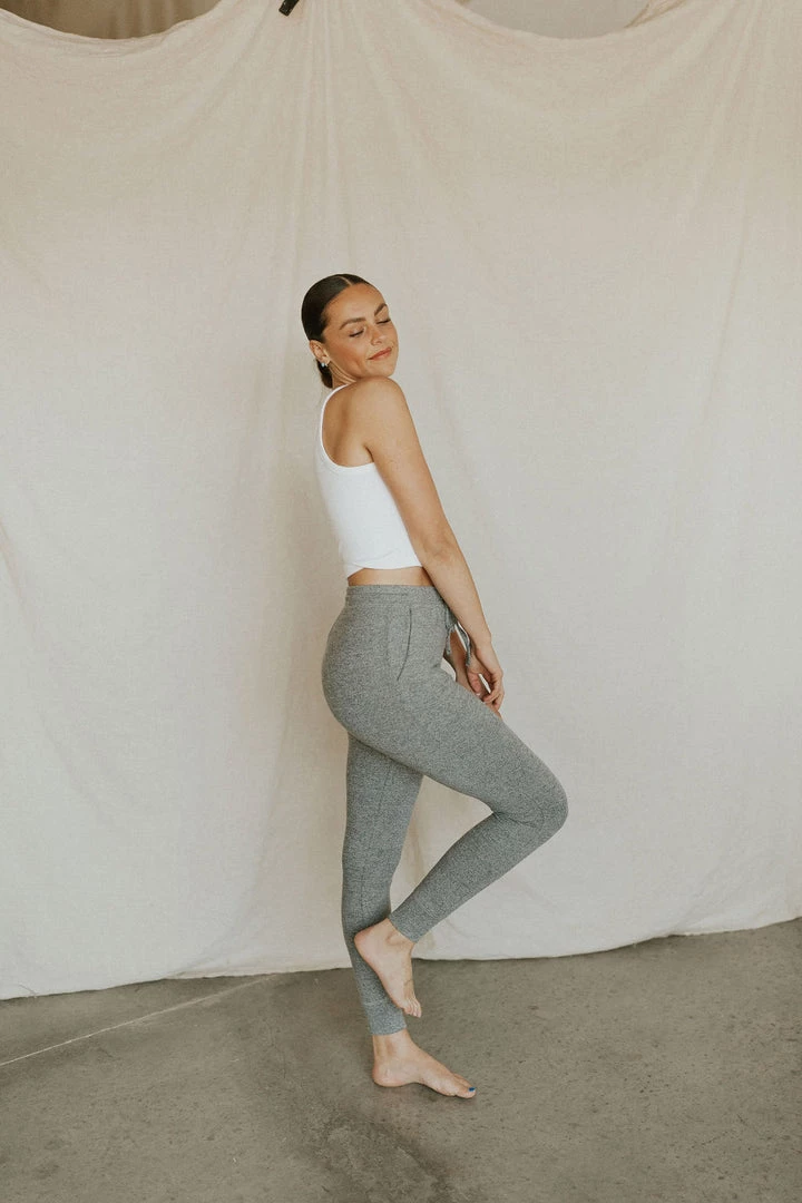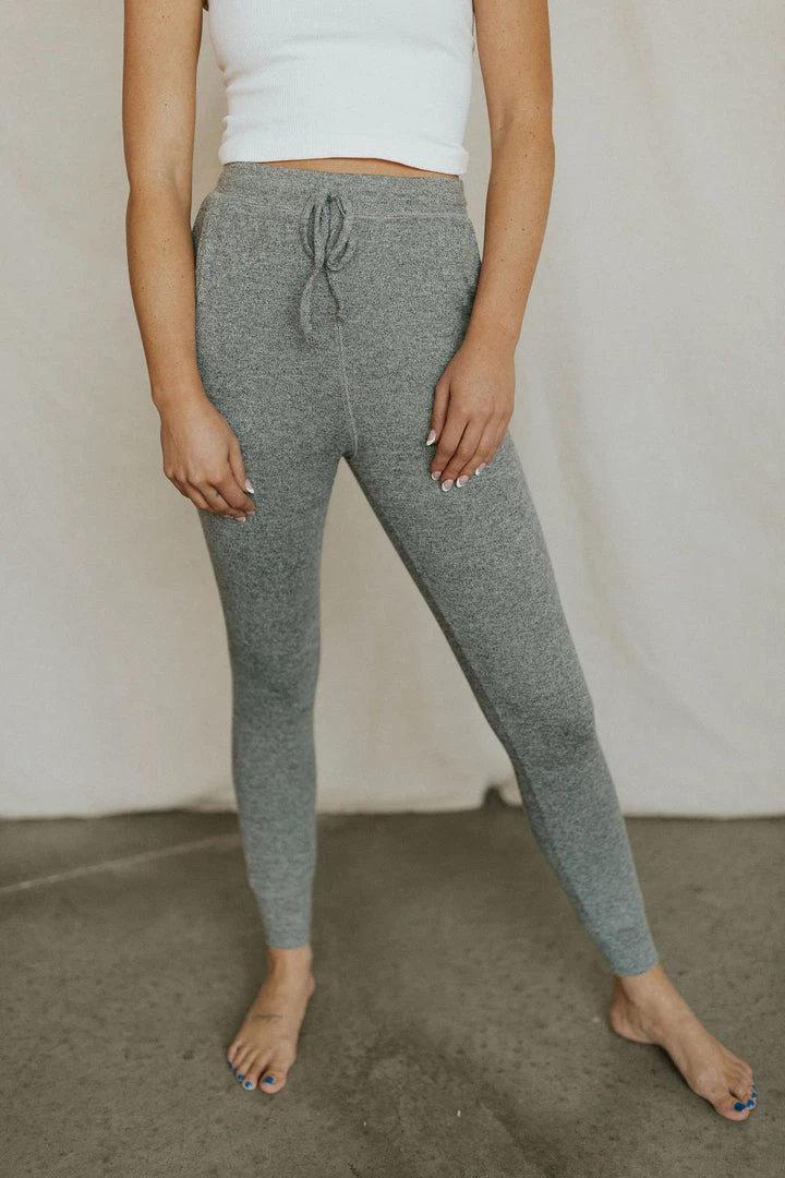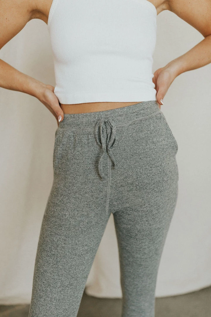 The SOFTEST joggers. Heathered grey. Elastic waist with tie and side pockets. Lots of stretch.