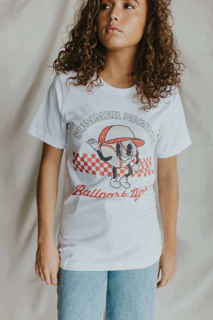 Graphic tee in white with baseball print on front. Soft washed look and feel.