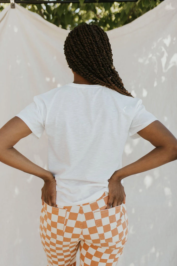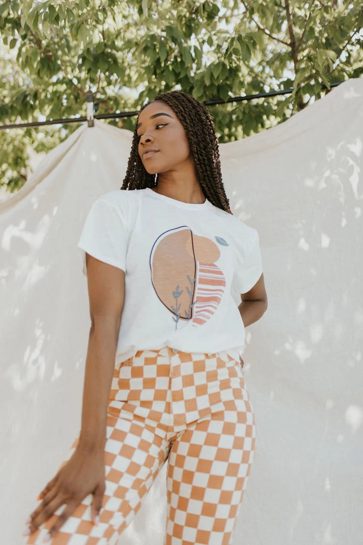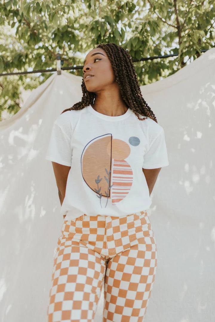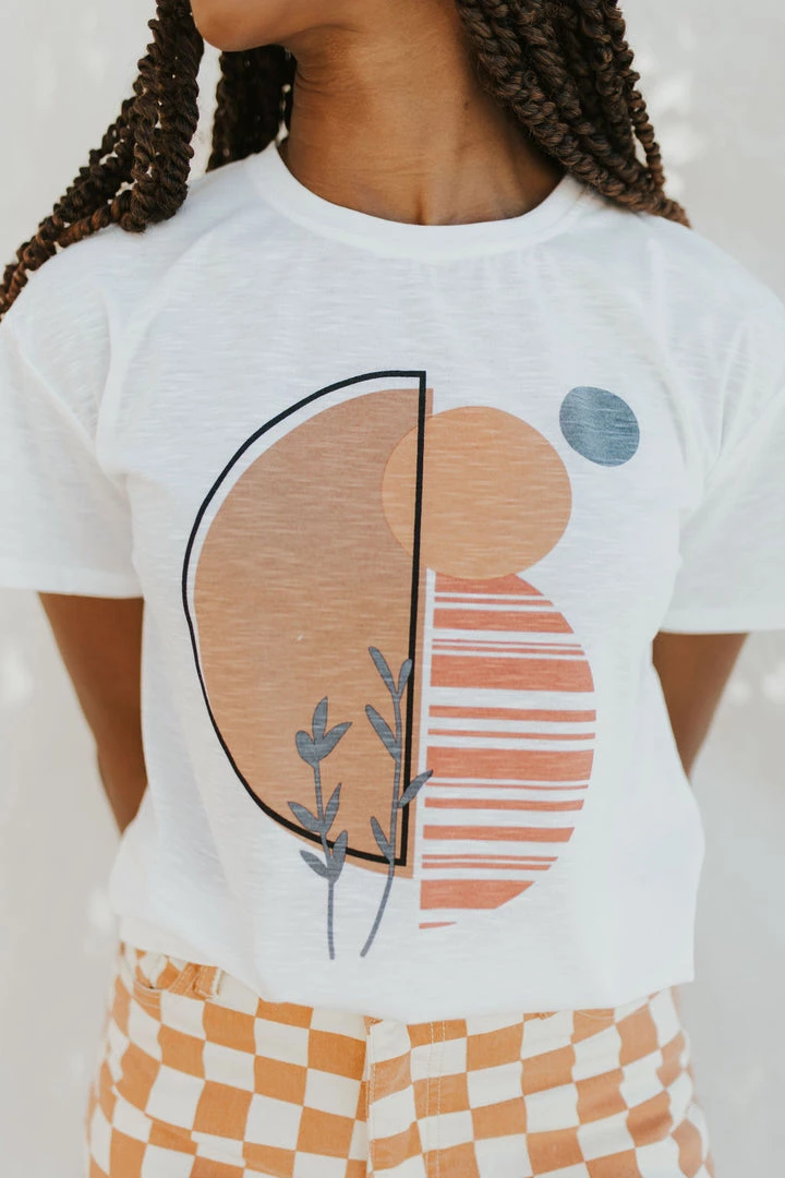 Graphic print tee. Graphic print of abstract sunset on front. Soft washed look and feel.