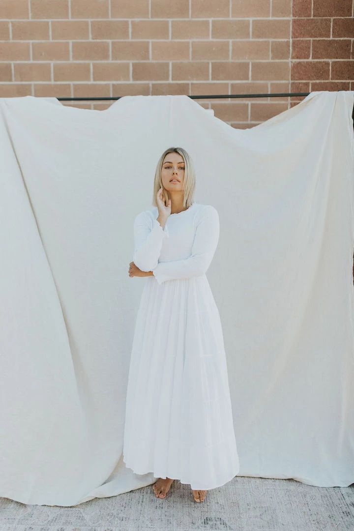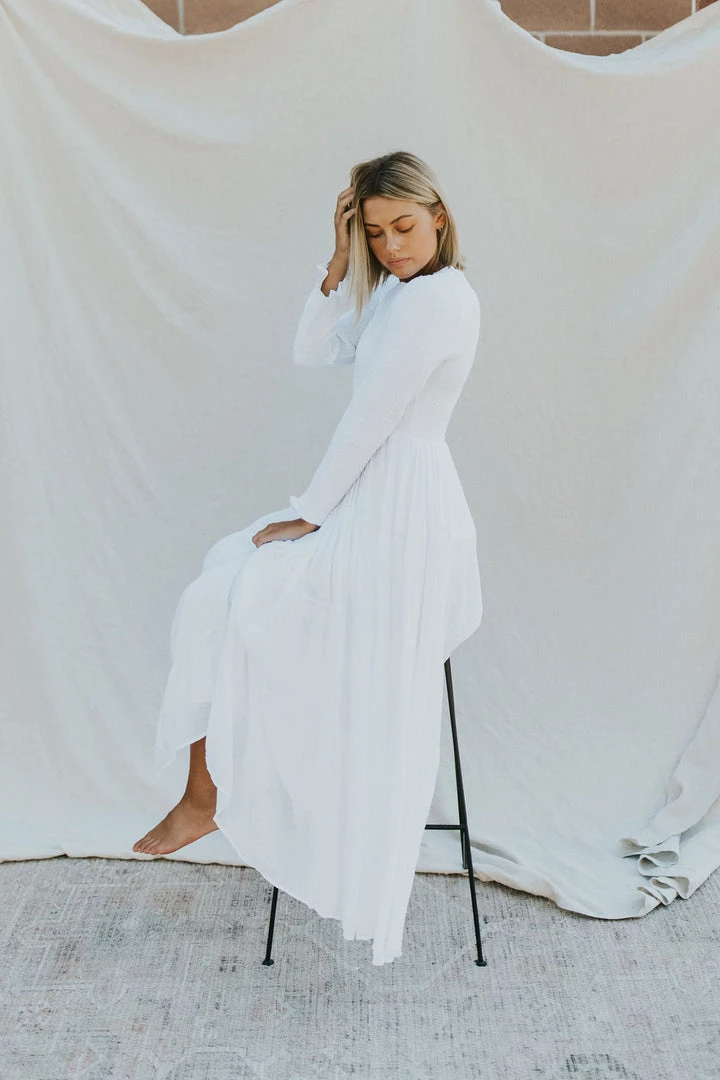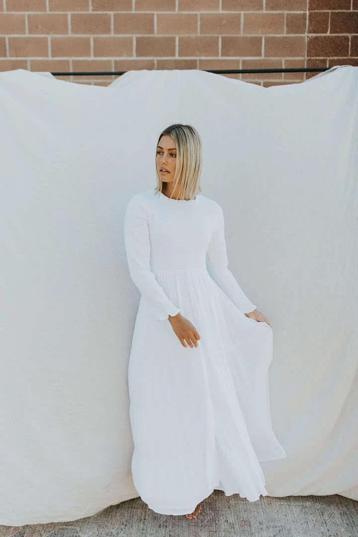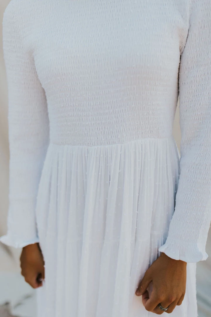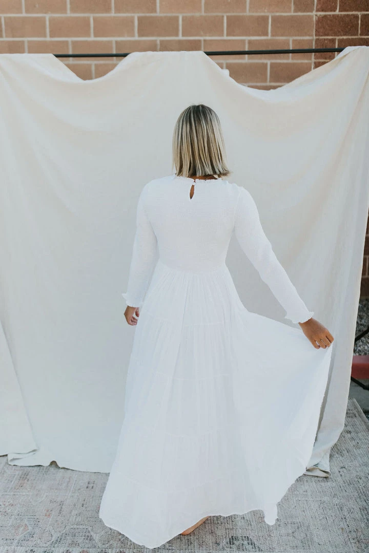 Smocked maxi in white. Smocked body and long sleeves with ruffle neck detail. Swiss dot tiered skirt with lining.