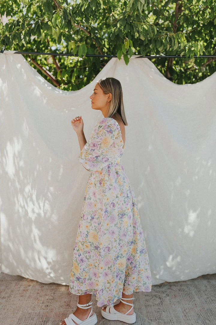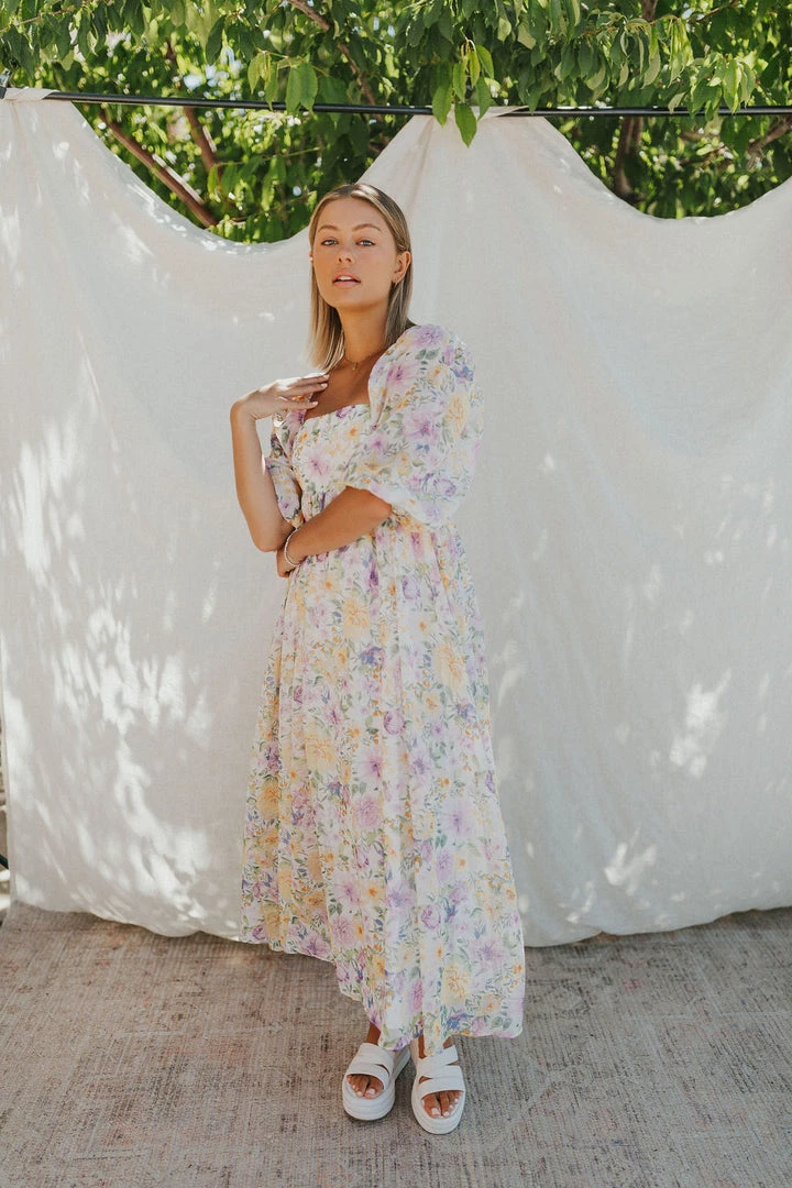 Shimmer floral maxi. Square neck with elastic sleeves. Can be worn on or off the shoulder. Back zipper. Sheer fabric. Sheer sleeves with lined body.