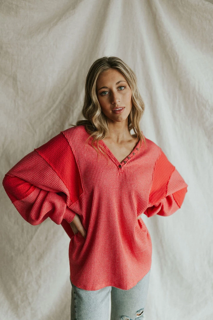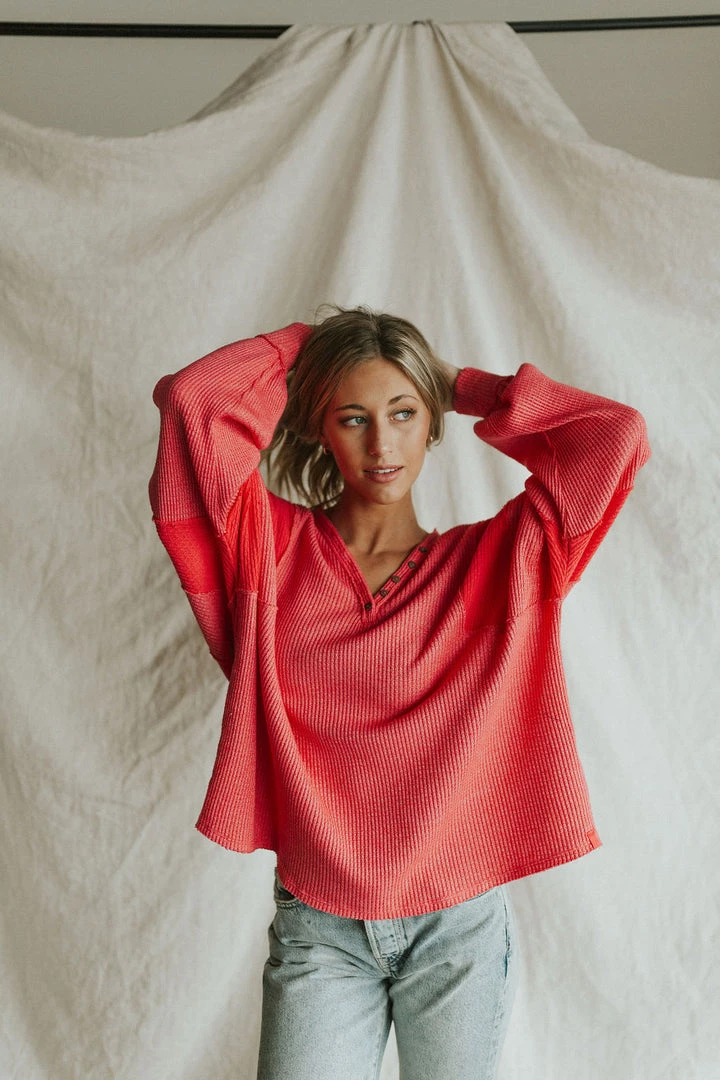 A true goes-with-anything essential, this cool and classic henley top is featured in a staple waffle knit fabrication with striped detailing and dropped dolman sleeves for an added slouchy shape. Oversize fit. MSRP $88