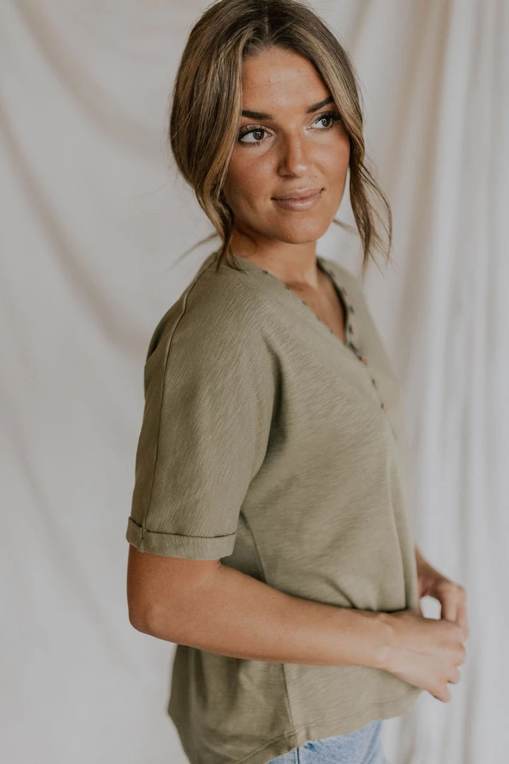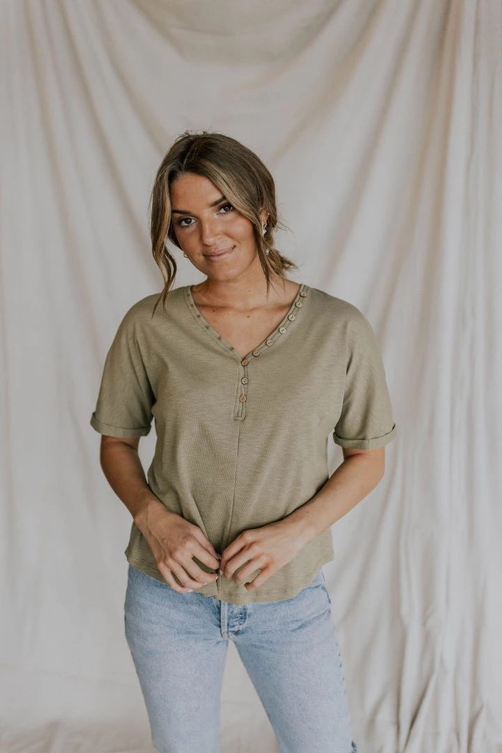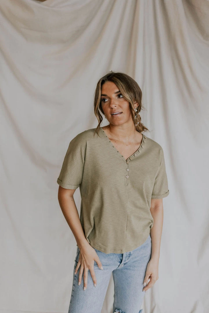 V-neck tee. Wood button front. Cuffed sleeves. Scooped hem. Lots of stretch. Nursing friendly. Available in multiple colors.