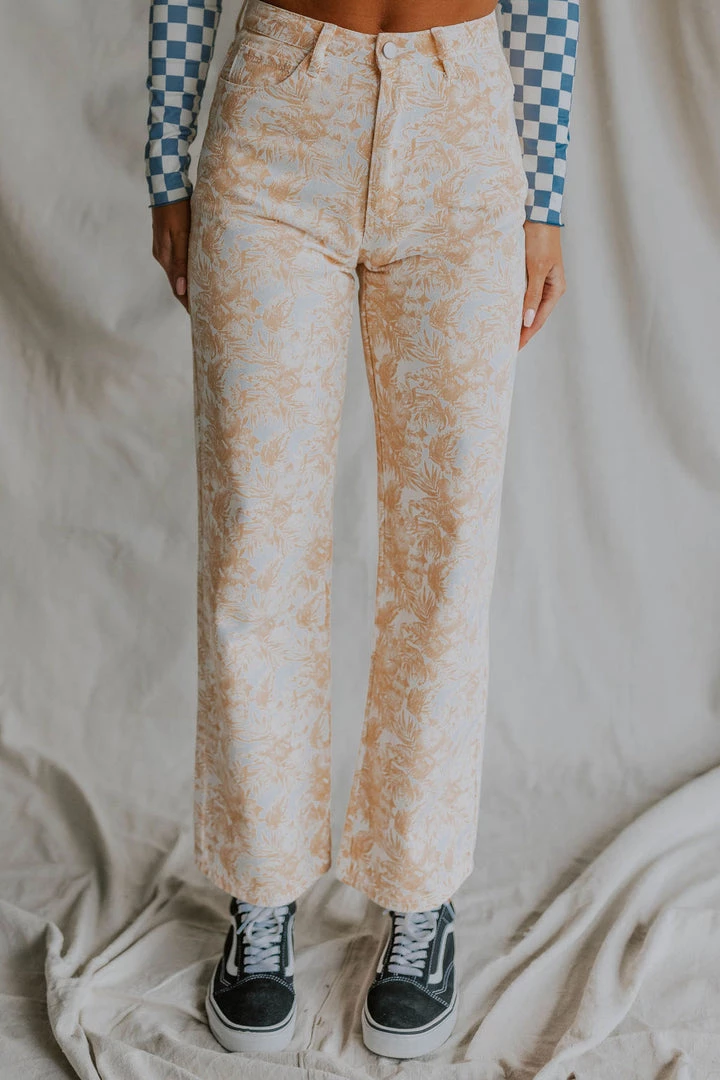 Colored denim pants in tangerine. Tropical print. Soft lightweight denim fabric with little stretch.Â