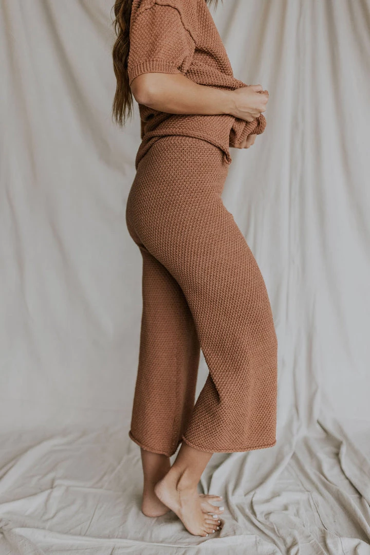Sweater pants with loose knit. Elastic waist with slightly flare in pants. Pants are lined to the knee. Pair with the Tulum Knit Top in Brick