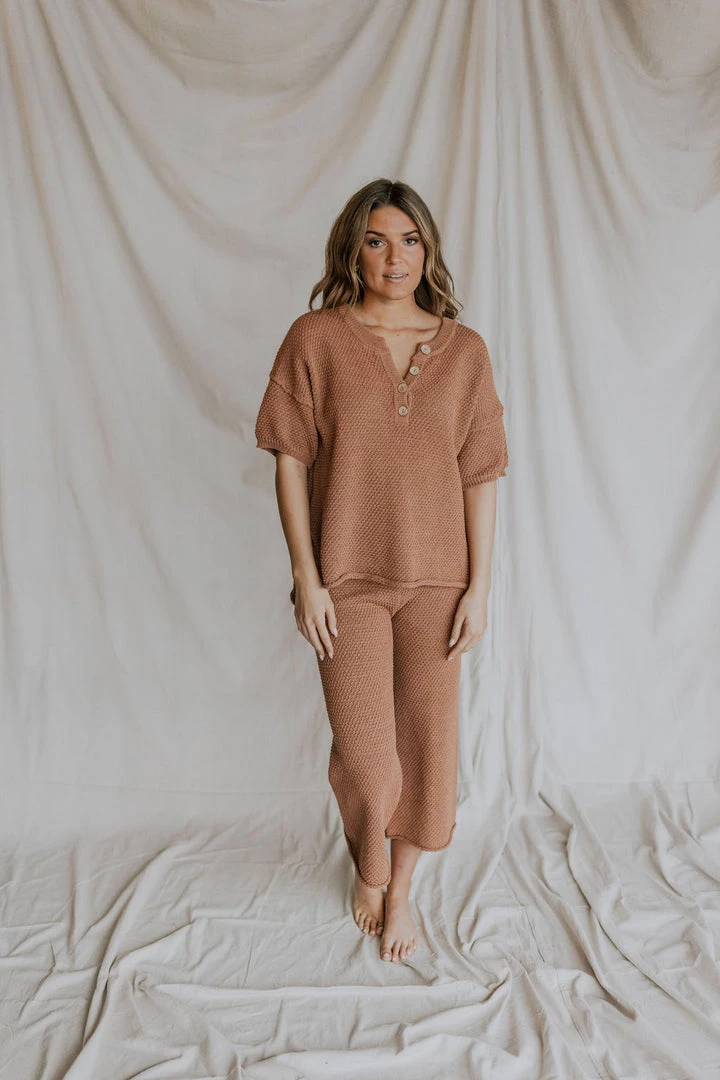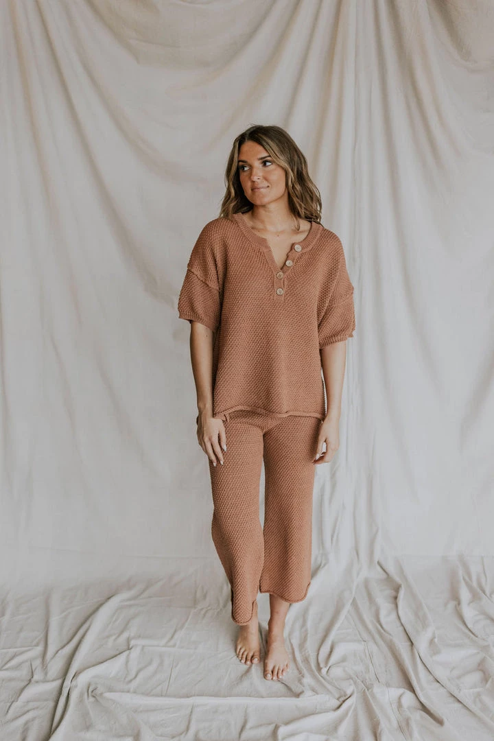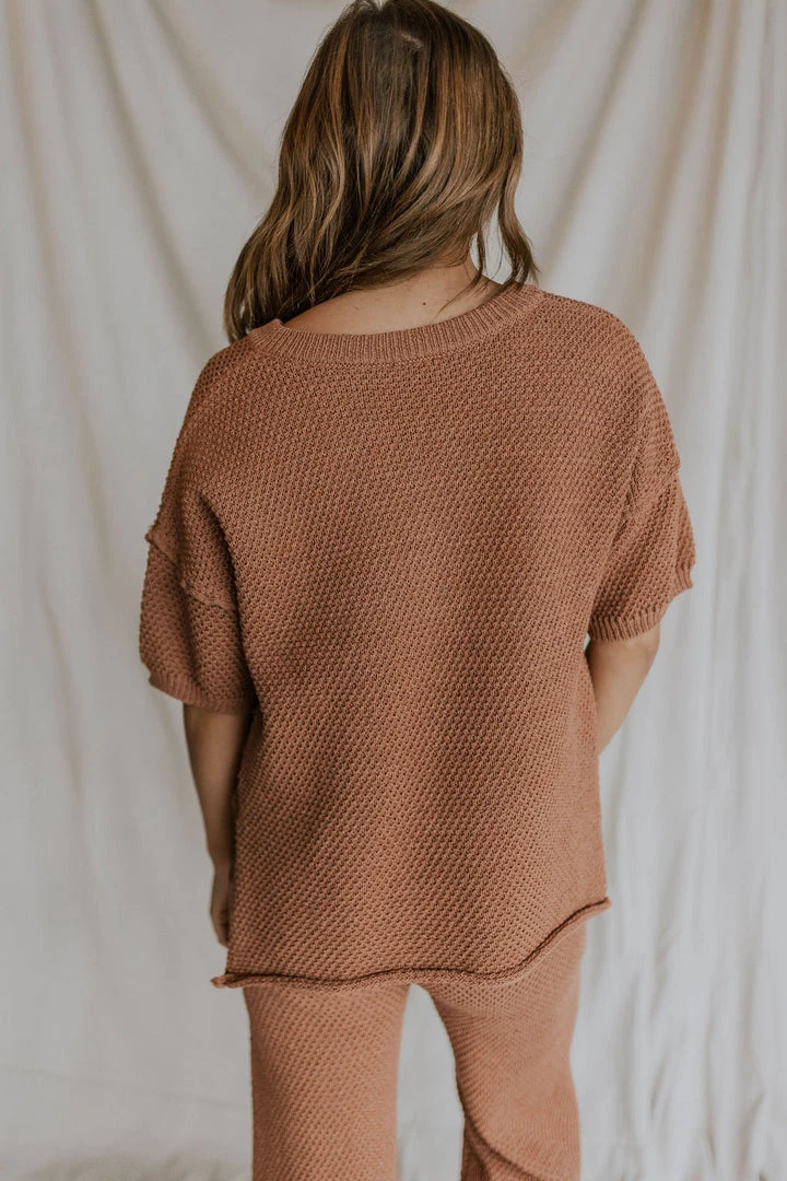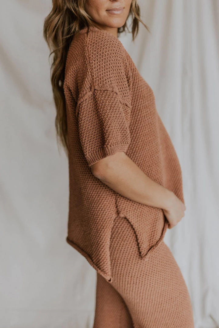 Loose knit short sleeve top in brick. Wood button front detail. Nursing friendly! Longer length with 8″ slits on sides.