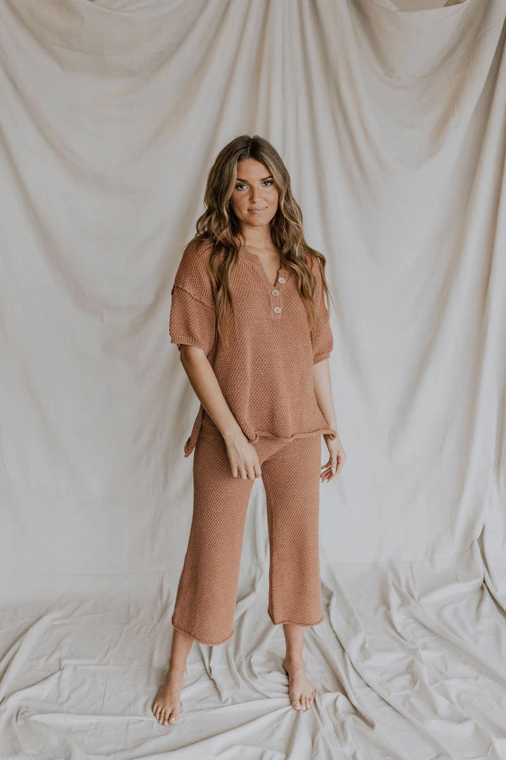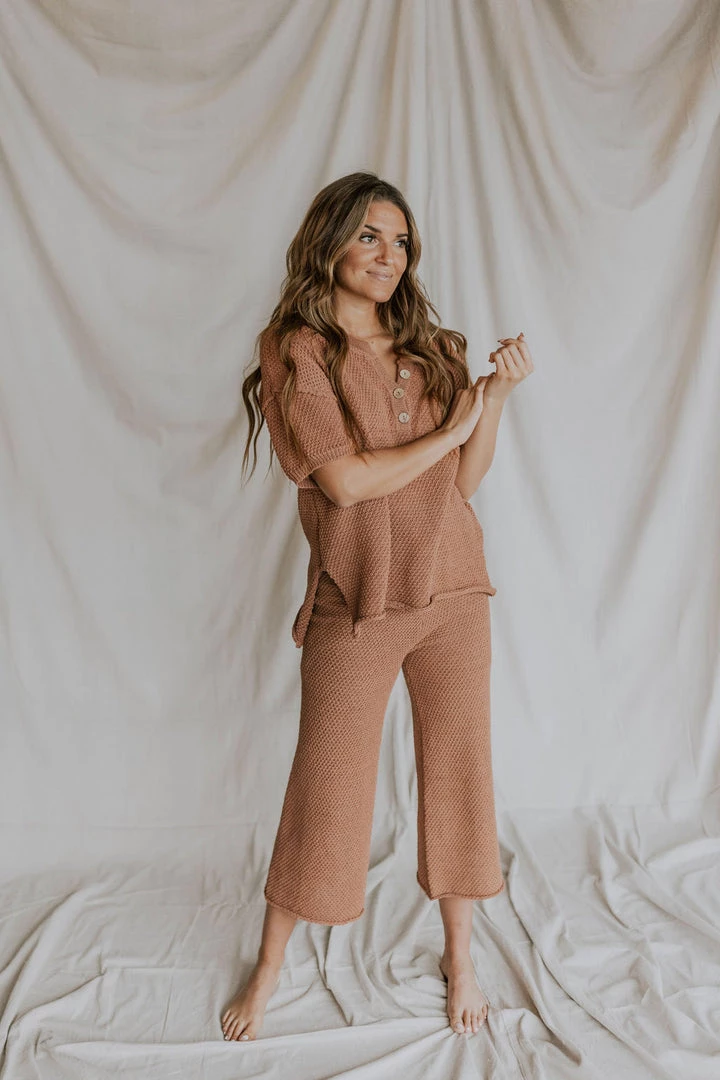 Model is size 2 & 5’4″ wearing Small. Paired with the Tulum Knit Pant in Brick.
