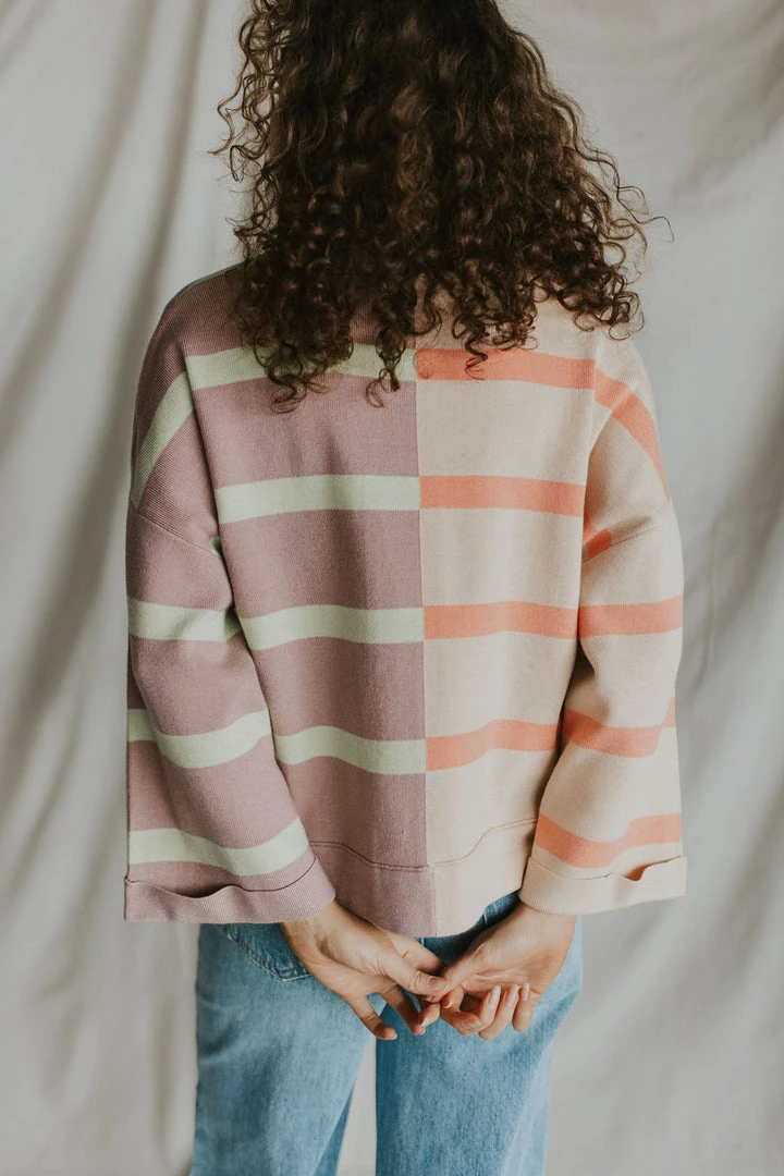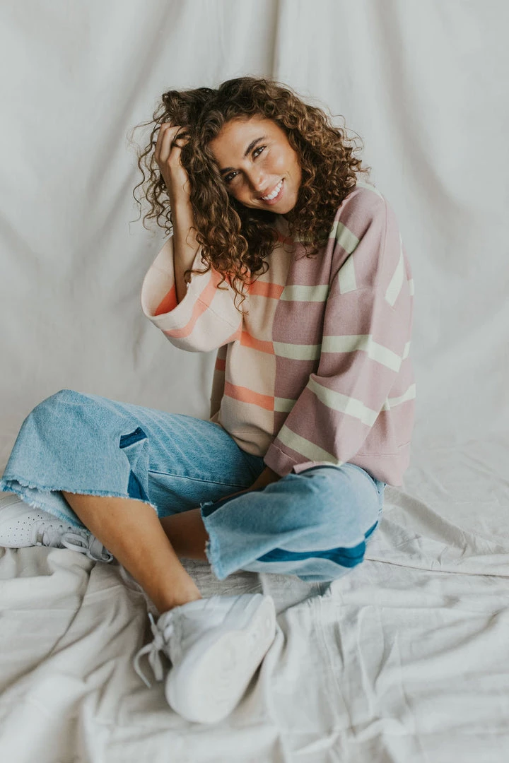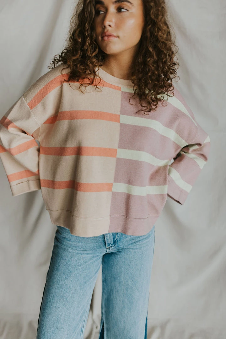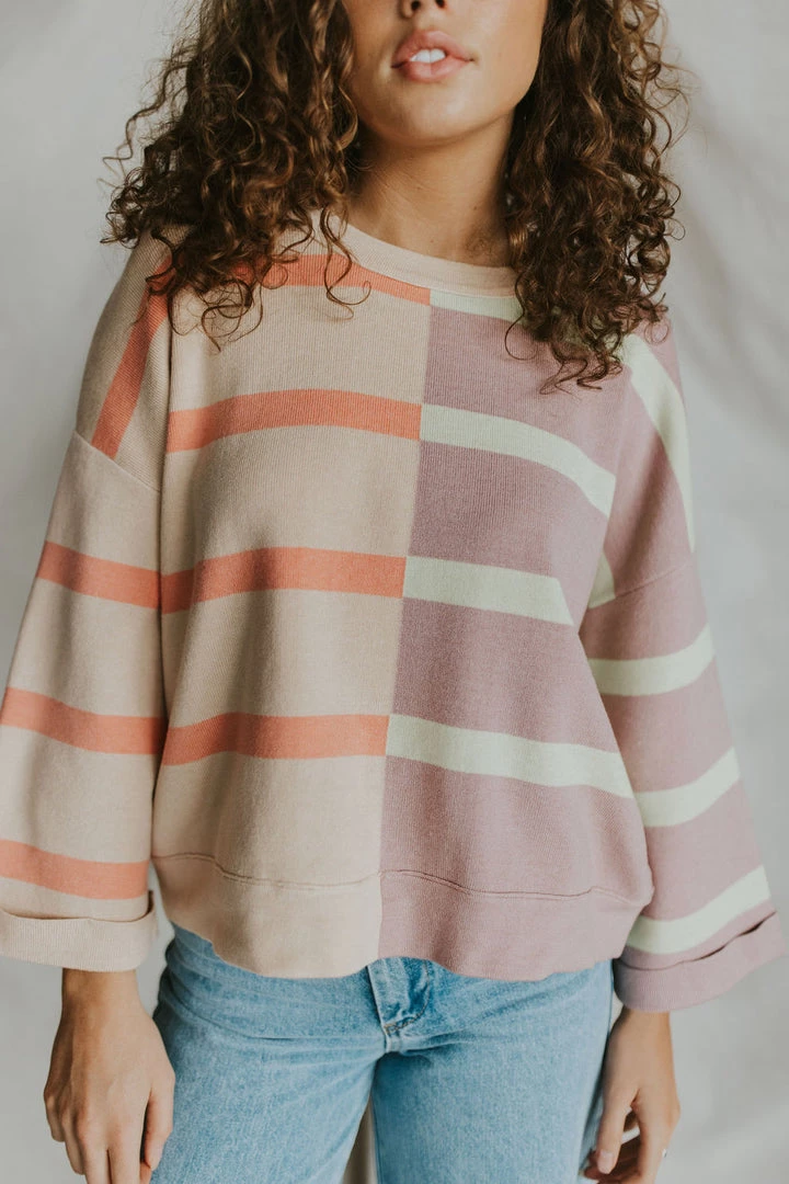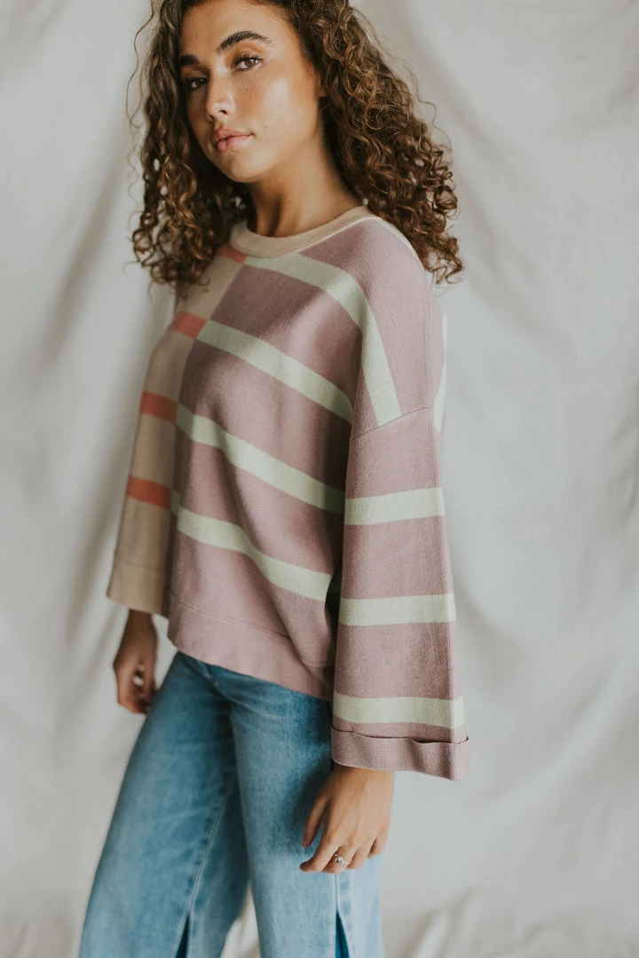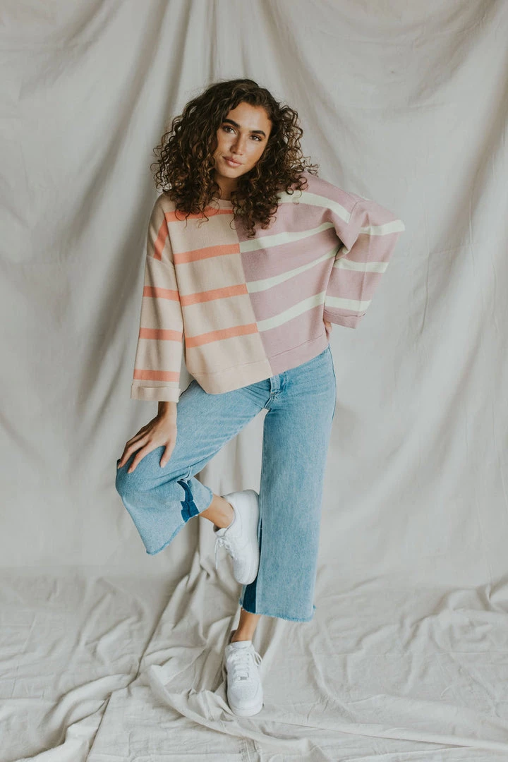 Buttery soft sweater in pastels. Cropped length. Boxy fit. Three quarter length sleeve with wide width and cuffed bottom.