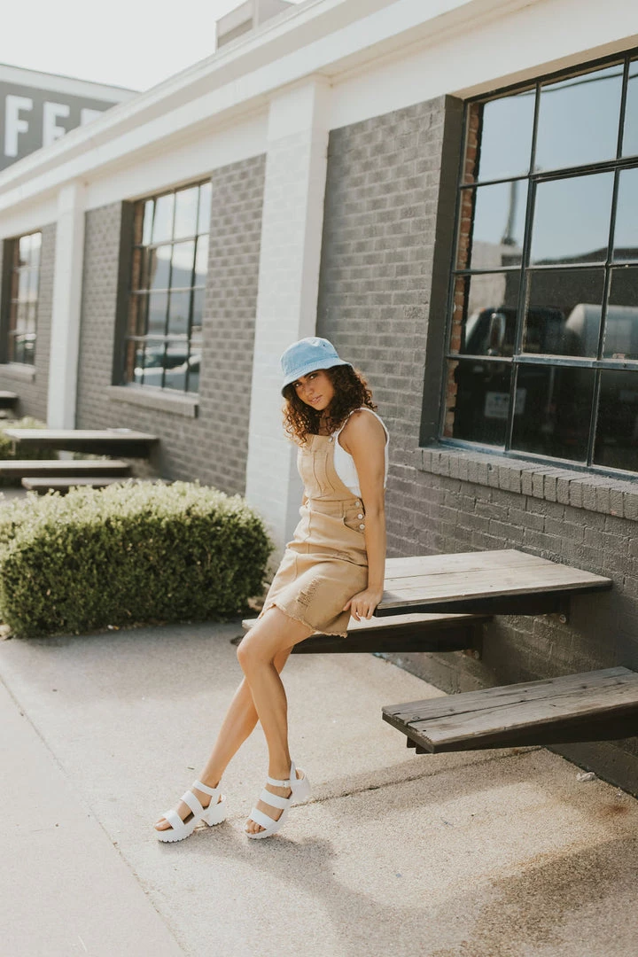 Model is size 2 & 5’9″ wearing Small. Paired with the Denim Bucket Hat, Claude Knit Crop in White, Dooney Platform in White.