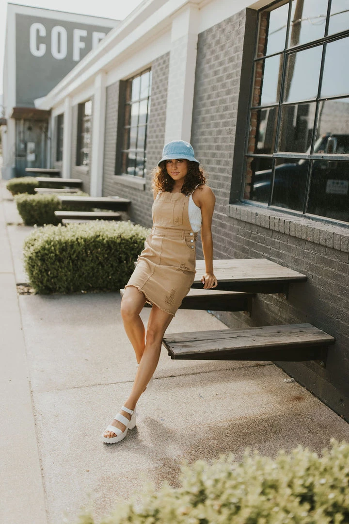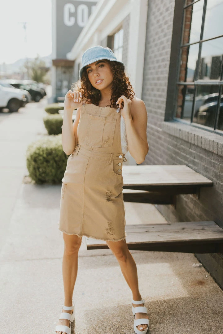 Distressed overall jumper dress. Adjustable straps for added length and fit. Functional button sides. Nursing Friendly!! Fabric has some stretch. Raw hem detail. Â