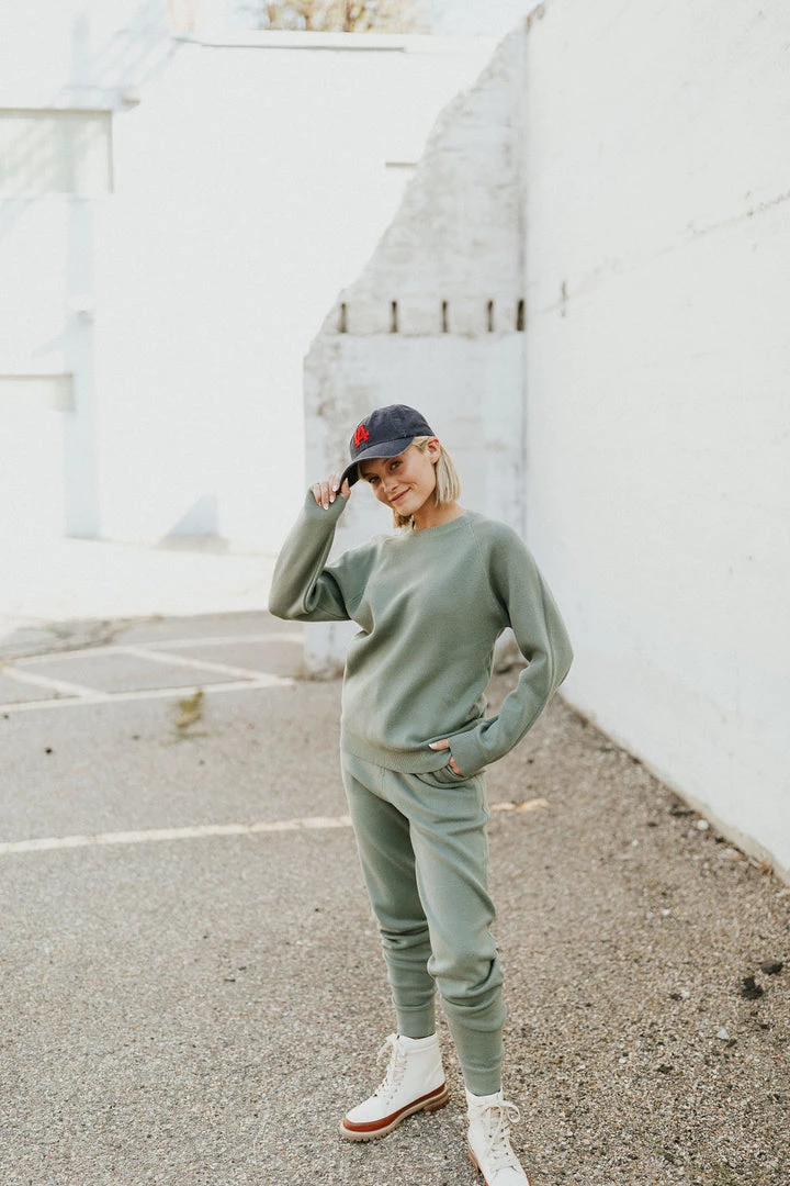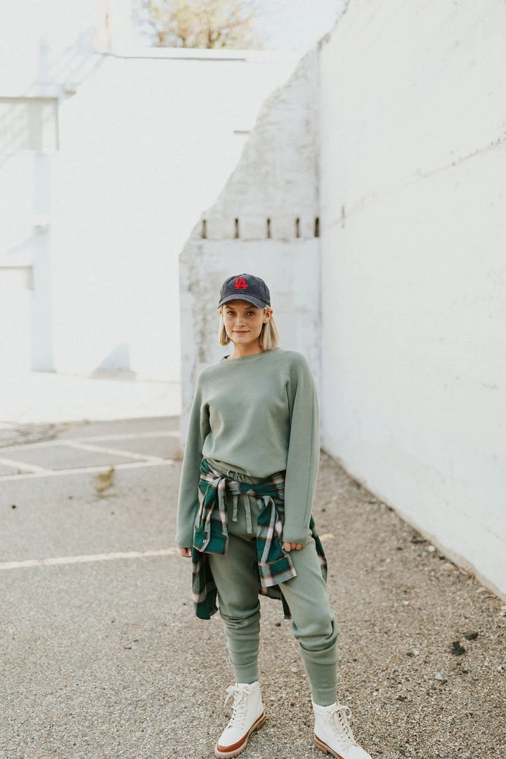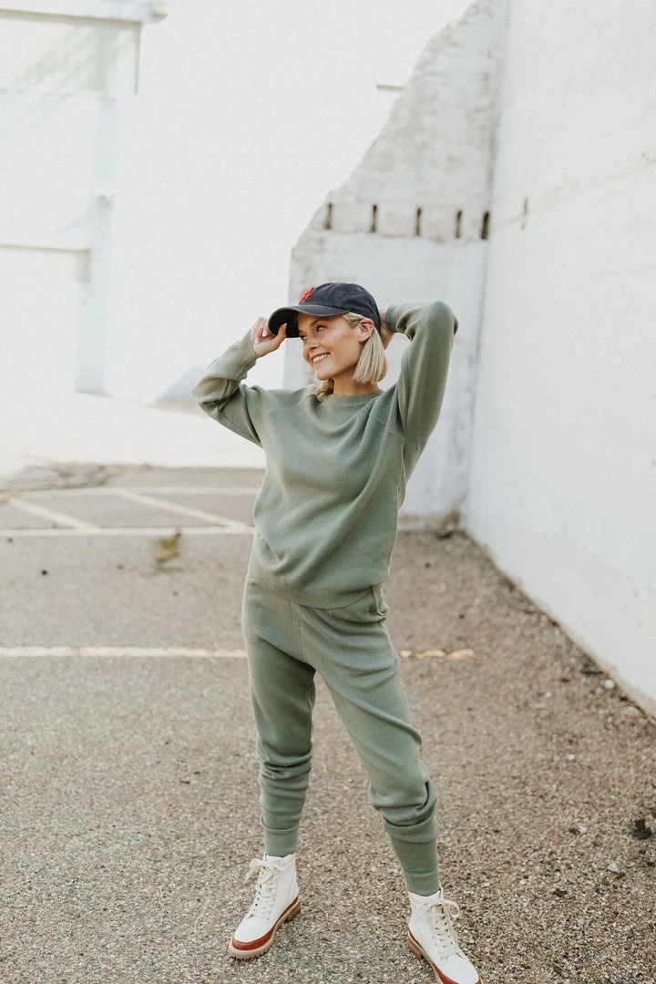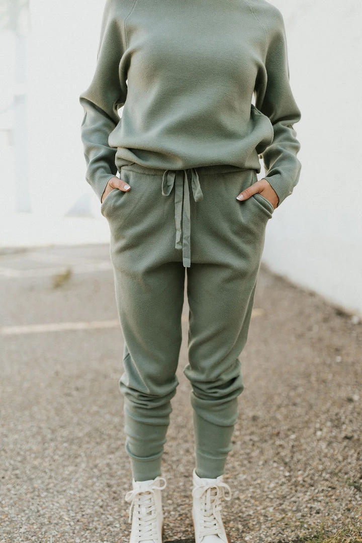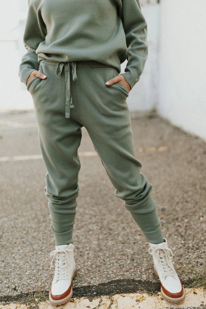 Soft sweater pants. Jogger pants have side pockets. Stretchy ribbed waistband with tie. Available in multiple colors. Pair perfectly with the Zuri Sweater.